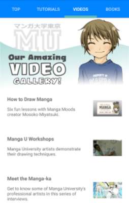 MAKE SENPAI NOTICE YOU! Download Manga University 101 and start drawing! This app is made in Japan by the art professionals at Manga University, publisher of the worldwide bestselling “How to Draw Manga” series of books. We created this app so you can enjoy all of our free drawing tutorials on your Android devices. Now you can learn manga and anime techniques wherever you are! The app also features a complete catalog of Manga University books (with links so you can get them in the Google Play store); our popular gallery of YouTube videos (including the all-new "How to Draw Manga" series featuring Mosoko Miyatsuki); and news and interviews featured on our Tokyo Campus Blog. SENPAI WANTS TO HEAR FROM YOU! If you enjoy our app, please be sure to tell your friends about it. We’d also love for you to rate and review Manga University 101 ^_^ Contact us with your feedback, questions and requests for new tutorials at [email protected] For more information about Manga University, visit us at howtodrawmanga.com Follow us on Twitter at twitter.com/mangauniversity Like us on Facebook at facebook.com/mangauniversity