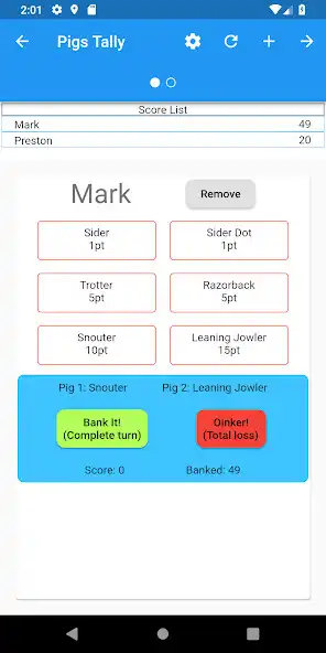 Use this simple application to keep track of your score when playing the popular game "Pass the Pigs".