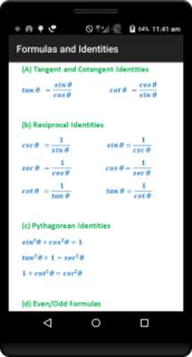 Trigonometry Quick reference guide has all the important formulas and concepts covered to help the student review them on regular basis. Topics include: a) Definitions - Right Triangle Definition and Unit Triangle definition b) Facts and properties of trigonometric functions i.e., Domain, Range and period c) Formulas and Identities (includes Tangent and Cotangent Identities, Reciprocal Identities, Pythagorean Identities, Even/Odd Formulas, Periodic formulas, Double Angle formulas, Degree to radian formulas, Half-angle formulas, Sum and Difference formulas, Product to sum formulas, Sum to product formulas, and Co Function Formulas) d) Unit circle explained e) Inverse Trigonometric functions and its properties f) Law of sines, Cosines and tangents which are define the relationship between the angles of a triangle and its sides. I wish this app to be use-centric. So, I would like to request you to try this app and make any suggestions to improve it further. I will be happy to provide updates based on your inputs.